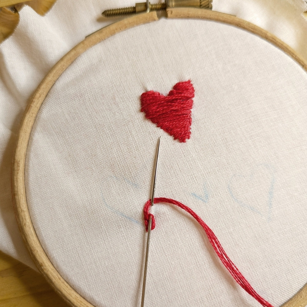 3. Switch to a horizontal satin stitch. Knot the thread and bring the thread to the front of the fabric following the template create horizontal stitches filling the heart shape.
