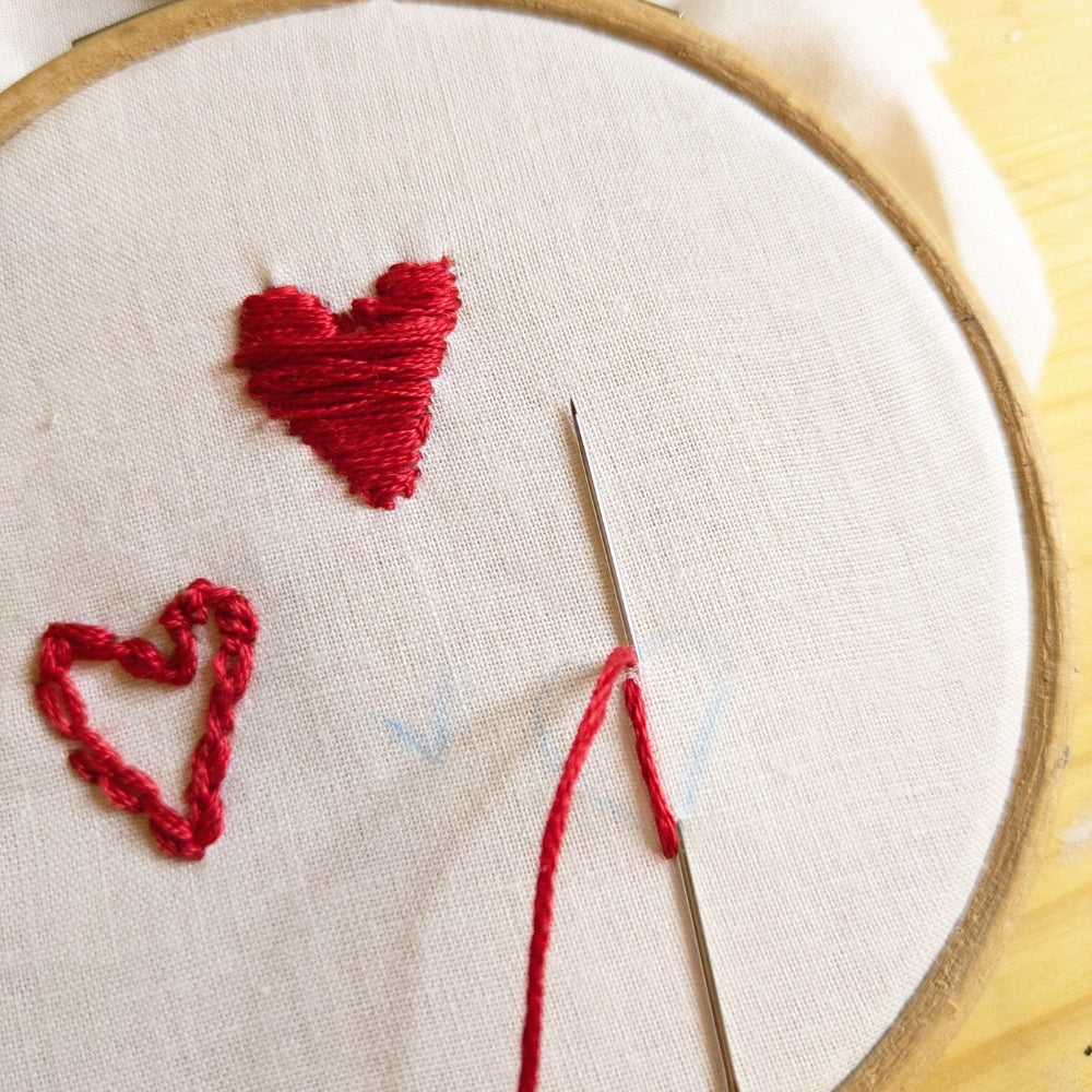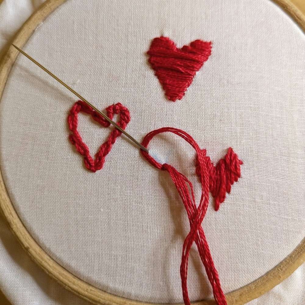 When you place your fabric in a hoop, keep the tension firm but not tight just enough to hold the fabric steady without stretching the knit structure. This guide uses DMC Thread No 321 a smooth and versatile stranded cotton that works beautifully for small Valentine details.
