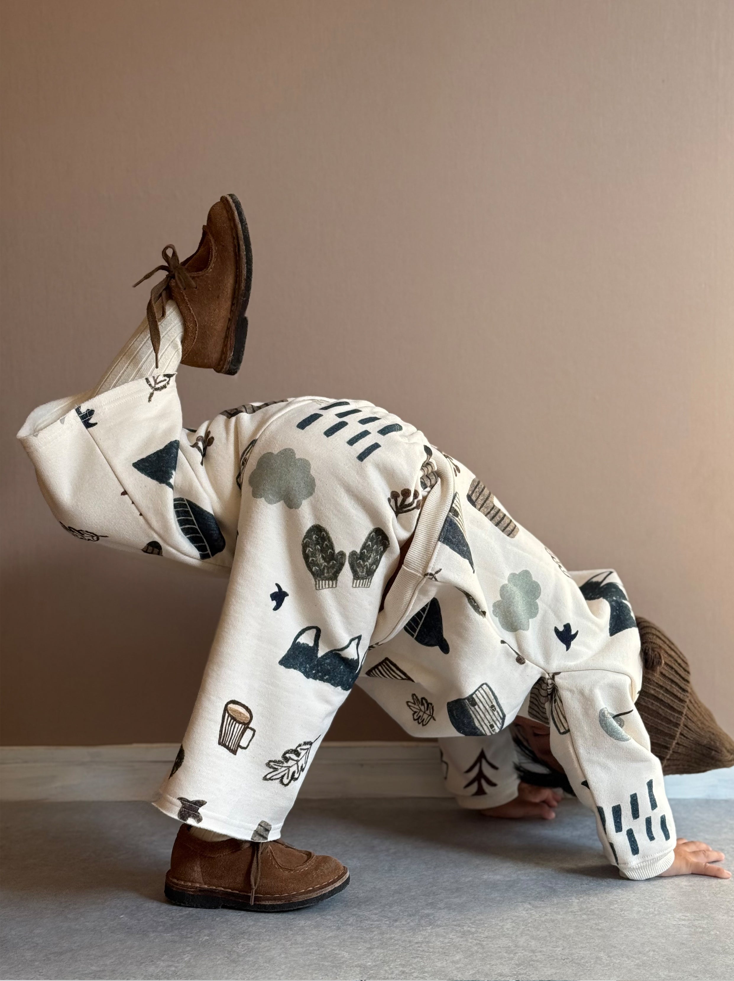Paulina and I worked very closely right from the start, she had a very clear vision and idea for this collection, which she was able to brief me very clearly. I was immediately drawn to the ‘Cosy and Wild’ theme, I felt like it was almost paradoxical, which made the collection very interesting for us to work on. During my creative process and while coming up with ideas, I drew up a list of cosy and wild elements and then I handpicked the most suitable ones. Every element, I felt, had to have the potential where I could create or tell little stories from, whether on its own or when placed together with other elements. My hope was that each element could spark the imagination and stories between parents and their children, as they pick out or put on any piece of the collection. Or, as kids love to pretend play, these elements can also be a form of their creativity and expression. When I had finally completed my elements and drawings, I saw how Paulina’s expertise in textiles and the design of the collection helped bring all of my drawings to life, which was amazing. Every idea and intent for the illustrations came through in the pieces; there was no compromise. I was really thrilled to see the end results and the quality of the actual pieces.