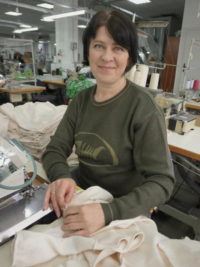 All our organic cotton pieces are designed in Brighton, England and manufactured in Ukraine. We took time to find the right place, a factory that could make our clothing the way we wanted, with care and kindness. Somewhere that focuses on people, not machines.